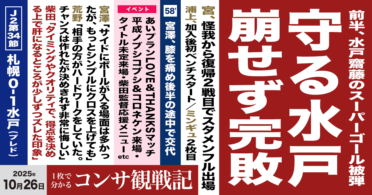 - 必然の負け、屈辱のホーム4連敗です。とにかくシュートが少ない。SNSに「ミシャの末期と同じ」なんてのを観たけど、攻撃的なサッカーは求めたいけど、結果が出ていないミシャサッカーの継続や継承はだれも望んでいないと思います。ミシャサッカーのアップデート、なら求めたいですけど、FWがシュート打てるような組織にしないと…。(剛蔵)