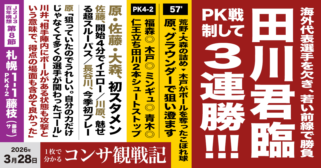 - PK戦勝利だが3連勝で勝ち癖、勝ち切るメンタルをどんどん付けていってほしい! あと、田川がただただ神だった。(ゴーパ)