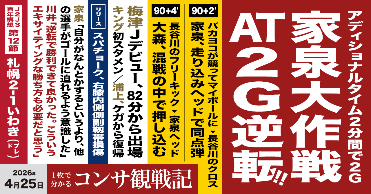• 過去にアディショナルタイムに3失点した試合を観戦した身としては、まさか2点取って逆転勝ちする歓喜の試合を見られるとは…(宮の沢さわこ)