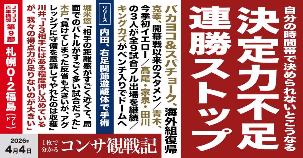2026年4月4日(土)、ホーム・大和ハウス プレミストドームで福島ユナイテッドFC戦です。